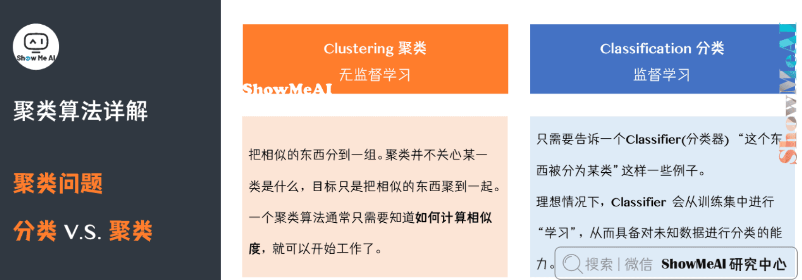 - 聚类是一种无监督学习,而分类是一种有监督的学习。