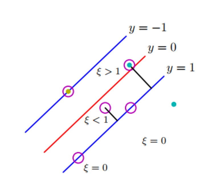 软间隔是指SVM在分类中允许出现分类错误的点,如下图所示。这些圈出的数据点都是支持向量,但是其中两个点不在蓝线上,一个在间隔内,另一个被分类错误(黑色直线所指的两个点)。软间隔允许这种情况存在,硬间隔则不允许。