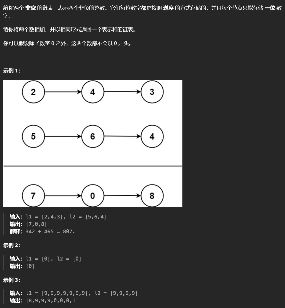 1 2 3 4 5 6 7 8 9 10 11 12 13 14 15 16 17 18 19 20 21 22 23 24 25 26 27 28 29 30 31 32 33 34 35 36 37 38 39 40 41 42 43 44 45 46 47 48 49 50 51 52 53 54 55 56 57 class Solution {public : ListNode* addTwoNumbers (ListNode* l1, ListNode* l2) { ListNode* prehead = new ListNode (0 ), *cur = prehead; ListNode *p = l1; vector<int > a,b; while (p){ a.push_back (p->val); p = p->next; } p = l2; while (p){ b.push_back (p->val); p = p->next; } int len = max (a.size (),b.size ()); int t = 0 ; vector <int > res; for (int i=0 ;i<len;i++){ int v = 0 ; if (i<a.size ()){ v += a[i]; } if (i<b.size ()){ v += b[i]; } v += t; if (v>=10 ){ v -= 10 ; t = 1 ; } else { t = 0 ; } cur->next = new ListNode (v); cur = cur->next; } if (t >= 1 ){ cur->next = new ListNode (t); cur = cur->next; } return prehead->next; } };