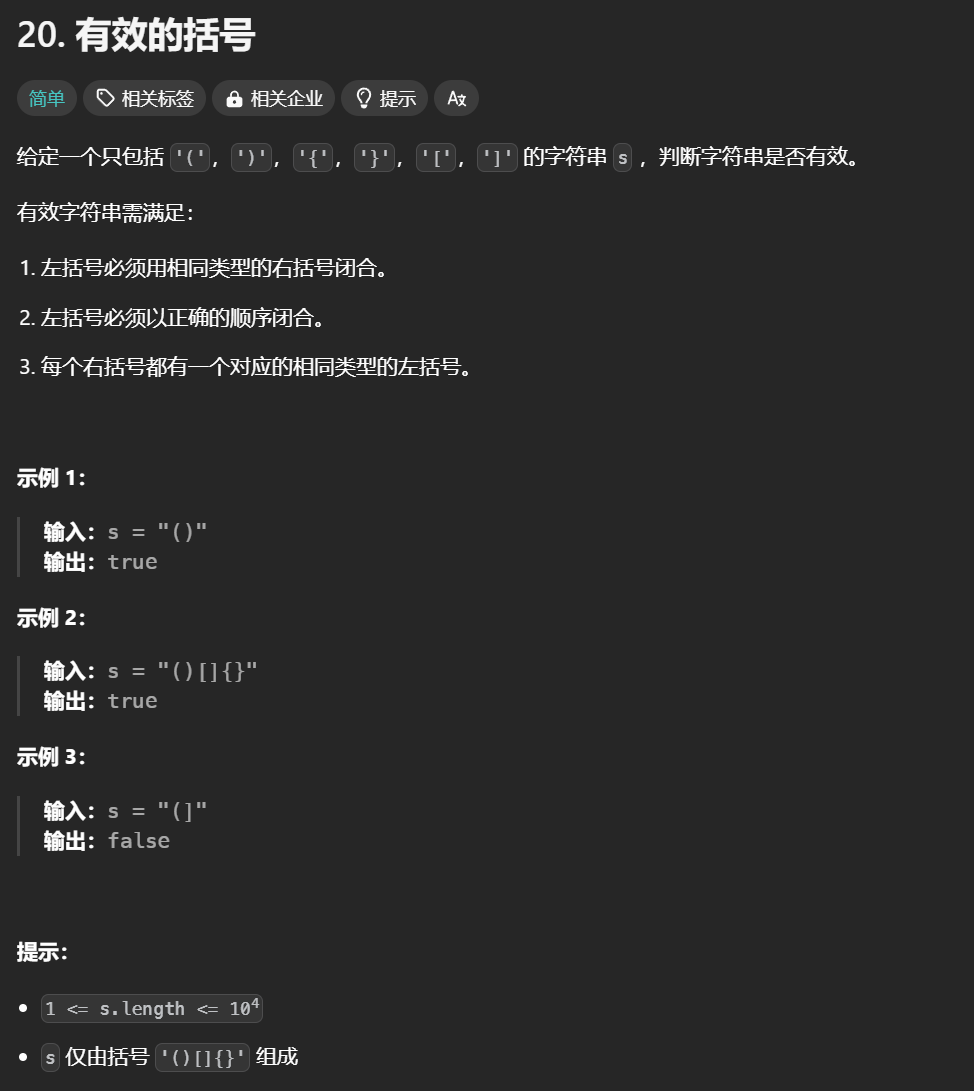 17. 电话号码的字母组合 20. 有效的括号 核心思想:栈的先进后出 (注意栈是否为空时的一些边界情况)