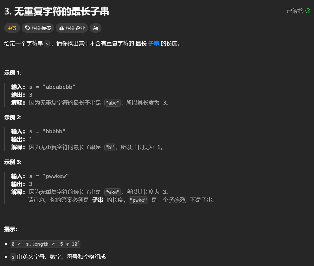 3.无重复字符的最长子串 核心思想:滑动窗口 + un ordered set tips: