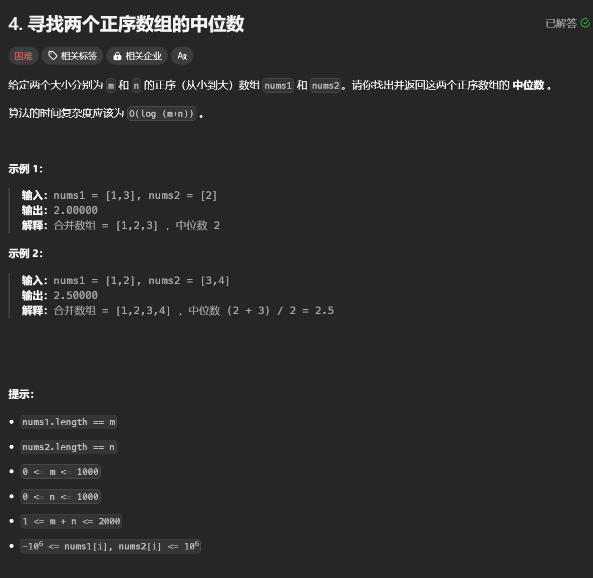 4.寻找两个正序数组的中位数 核心思想:先合并成一个单调递增的数组;然后计算新数组的中位数,算法复杂度为O(n+m); 还可以用二分优化到log(n+m);